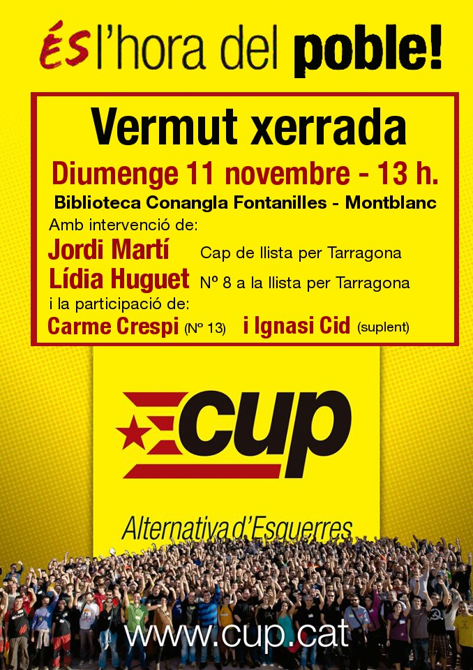Aquest diumenge dia 11 de novembre a les 13:00h a la Biblioteca Comarcal Conangla i Fontanilles de Montblanc tindrà lloc l’acte polític central a la comarca de la organització CUP-AE per aquestes eleccions al Principat de Catalunya.