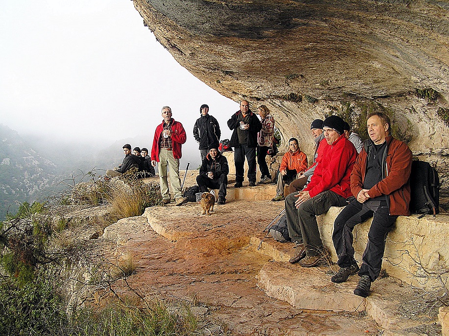Els caminants van aprofitar per contemplar les pintures rupestres que hi ha en aquest indret, símbols abstractes, un dels quals, el més gran, és l’anagrama identificatiu del CIAR (Centre d’Interpretació d’Art Rupestre) de Montblanc i on es pot trobar reflectit art rupestre de tot el món en diferents manifestacions.